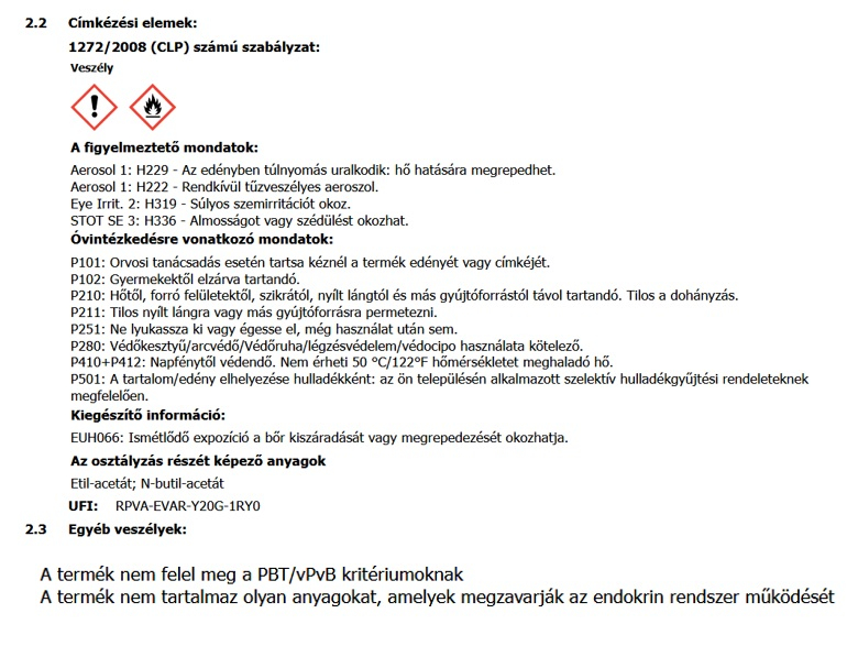 Rázza fel a tartályt legalább 3 perccel a keverőgolyó hallatán. Az első használat előtt permetezze a levegőbe 3-4 másodpercre, hogy eltávolítsa a lecsapódott színt. Használat után tartsa az aeroszolt fejjel lefelé, és tartsa lenyomva a működtetőt 2-3 másodpercig a szelep tisztításához. Ha a fúvóka eltömődött, cserélje ki egy újra. Használja szabadban vagy jól szellőző helyen, például nyitott garázsban. Optimális felhordás 10-25°C hőmérsékleten és 65% alatti páratartalom mellett a megfelelő száradás érdekében. Tárolás 5-35°C.