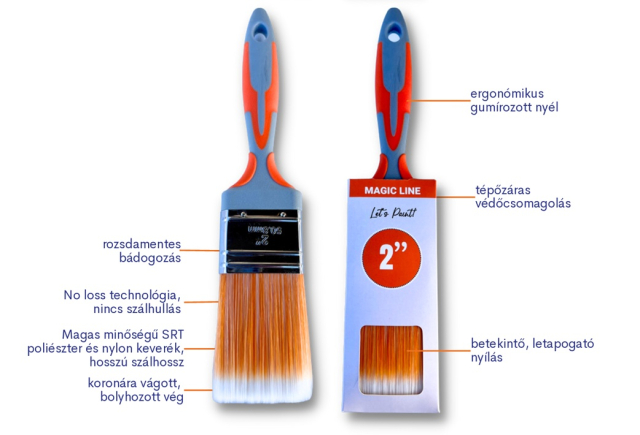 A Magic Line ecsetet diszperziós és oldószeres falfestékekhez, betonfestékekhez, homlokzatfestékekhez, alapozókhoz, lazúrokhoz, zománcfestékekhez és lakkokhoz ajánljuk.
