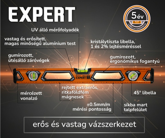 Az EXPERT vízmértékek jellemzői: UV álló mérőfolyadék, vastag és erősített, magas minőségű alumínium test, kristálytiszta libella, 1 és 2% lejtésméréssel, gumírozott, ütésálló záróvégek, gumírozott, ergonómikus fogantyú, mércézett vonalzó, rejtett extra erős ritkaföldfém mágnesek, 45° libella, síkba mart talpfelület, ±0.5mm/m mérési pontosság, erős és vastag vázszerkezet, 5 év libella garancia.